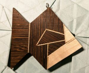 Je vous présente les 4 derniers pendentifs OrigamiBois. Un papillon, un jeune yoda et deux poissons. Lorsque je cherche les essences de bois pour créer les différentes pieces du « puzzle », j’aime varier les effets de la pièce finale. Par exemple , pour les poissons, dans le choix des bois, j’ai utilisé des veinages parallèles. Pour …